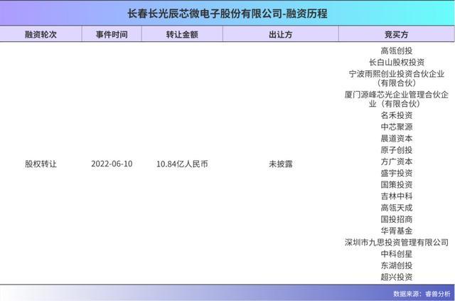 期间,长光辰芯主要依靠自有资金、项目经费和小批量订单维持运营,并未大规模引入外部市场化VC。直到2022年,公司以出售老股的方式,引入了高瓴、中科创星、方广资本等近20家机构,转让价格约27.03元/股,转让总对价10.84亿元,投后估值突破100亿元,而一年前估值仅约26亿元。
